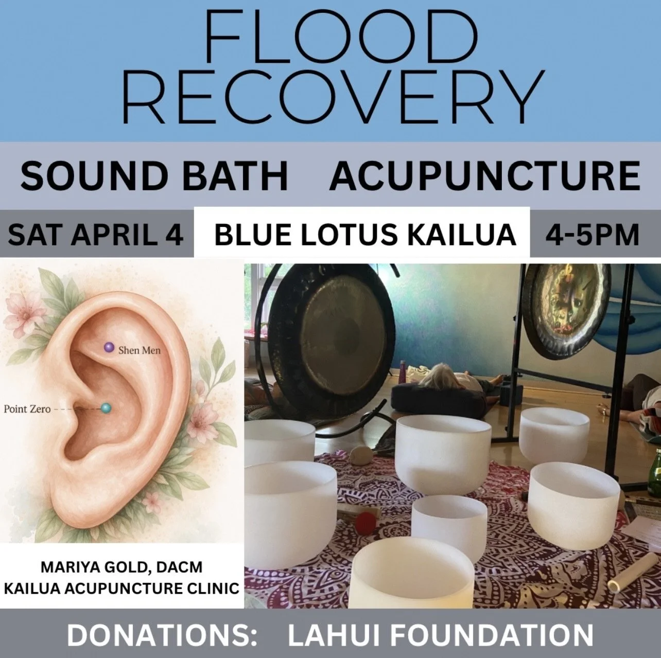 Sound Bath and Acupuncture for Flood Recovery Saturday, April 4, 2026 4:00 PM 5:00 PM 16:00 17:00 Google Calendar ICS Sign up with the Blue Lotus Glofox App..CONTACT:info@bluelotuskailua.com